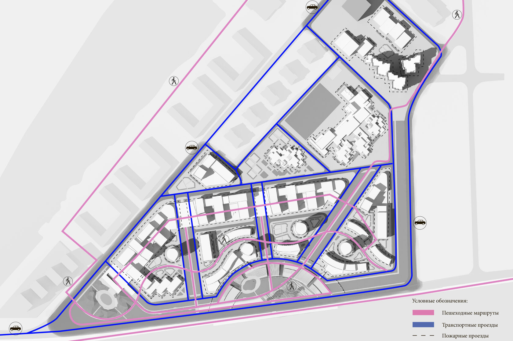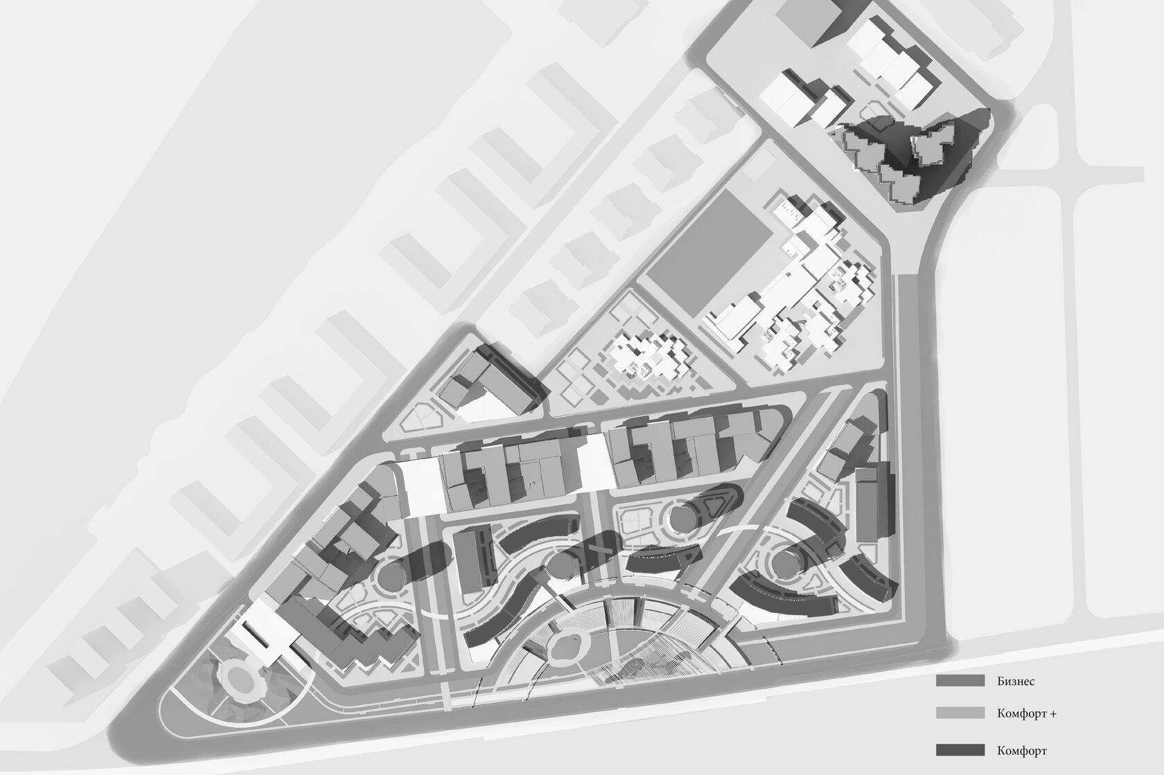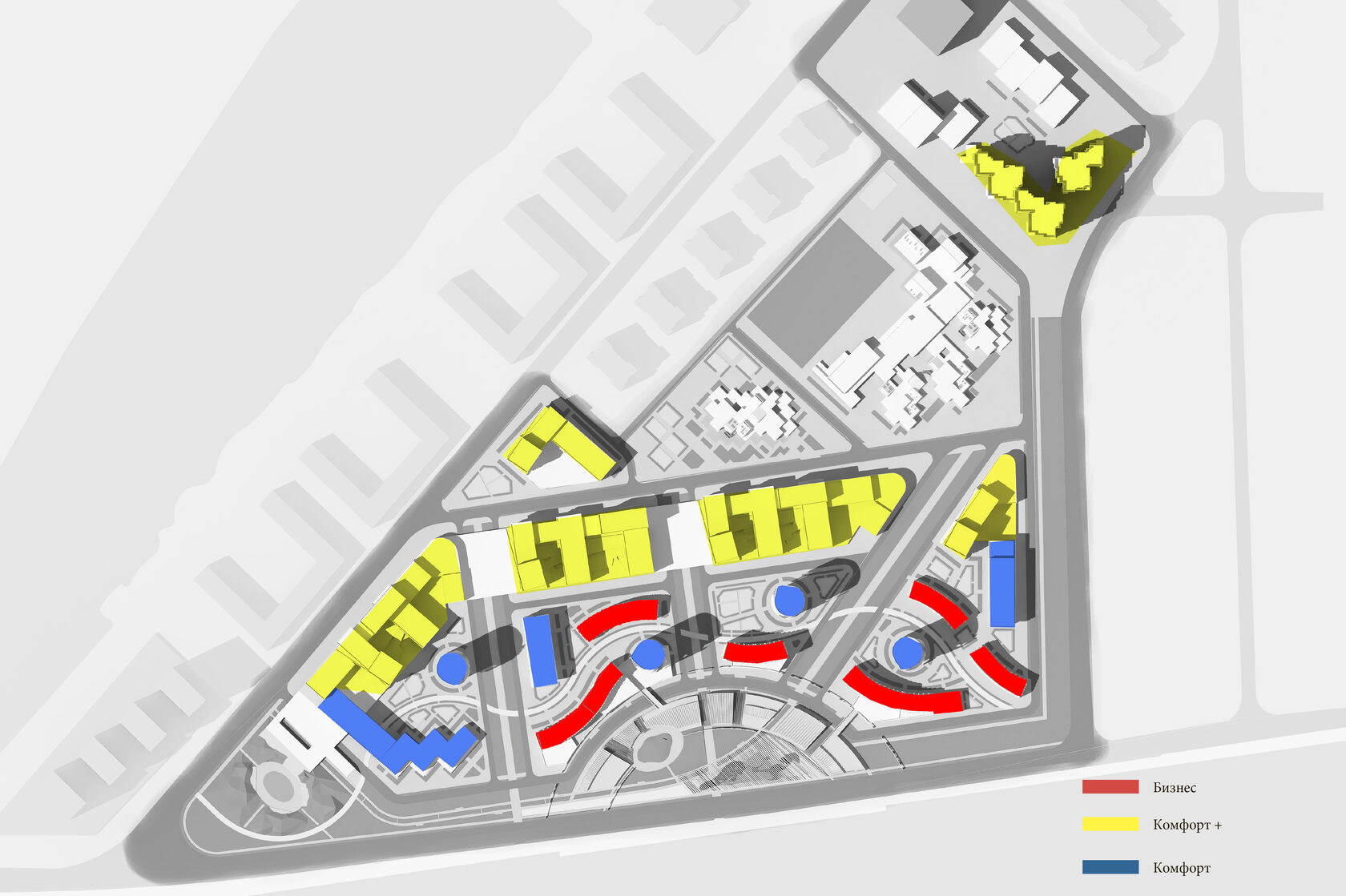 Концепцией предлагается строительство многоэтажной жилой застройки рекреационного характера, которая включает регулярные «квартальные» комплексы, здания башенного типа и протяжённые «ландшафтные» дома. Такое разнообразие позволяет создать живой силуэт и немного уйти от сухой регулярности заложенного ППТ генерального плана. При этом свободное, почти парковое расположение предлагаемой застройки не разрушает, а объединяет обозначенные красными линиями участки, организуя общий ландшафтный променад, «перетекающий» от участка к участку. Тема планировочных изгибов поддерживает дугу благоустройства набережной и подхватывается овальными планами отмечающих участки домов-башен. Нижние этажи жилой застройки занимают коммерческие помещения, учреждения обслуживания, дополненные пристройками, которые группируют отдельные здания, в то же время обеспечивая формирование наземного, приближенного к человеку масштаба.